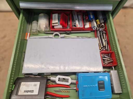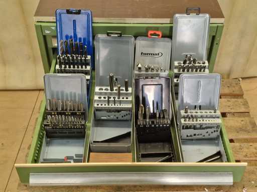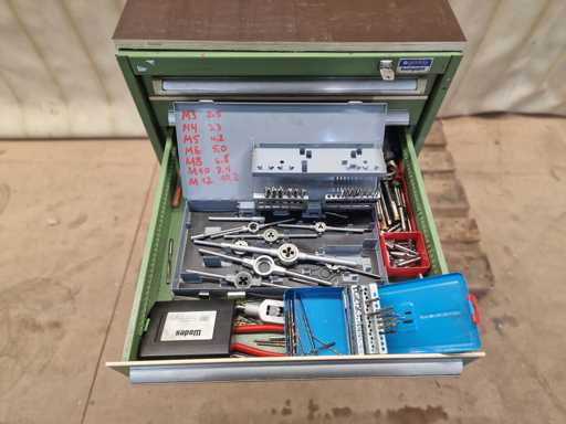 Inhalt bestehend aus Bohrer, Gewindebohrer und Matrizensatz.