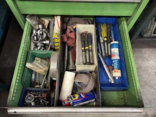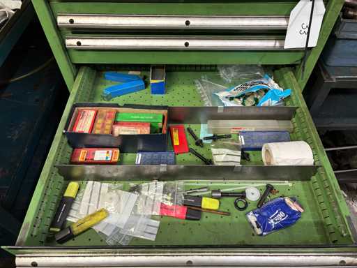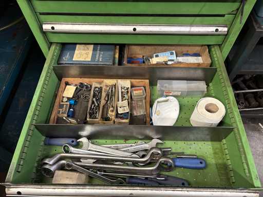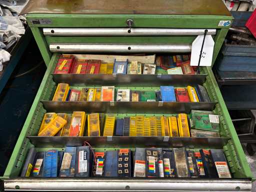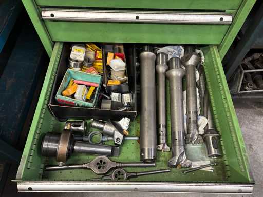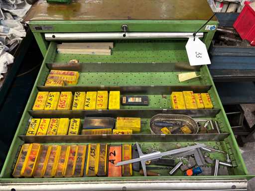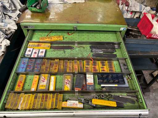 Inhalt bestehend aus diversen Wendeschneidplatten in verschiedenen Ausführungen und Größen, Maulschlüsseln, Gabelschlüsseln, Bohrstangen, Reibahlen und weiteres Zubehör für Drehmaschinen