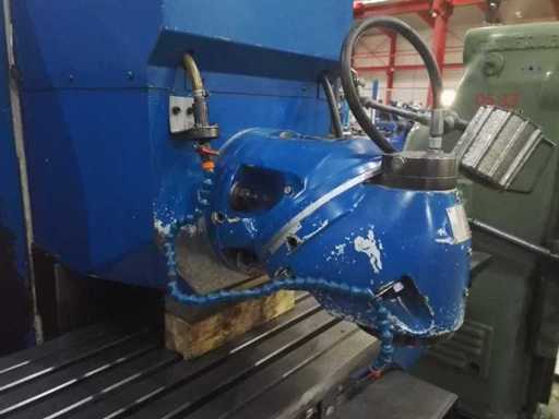 CNC-Fräsmaschine ausgestattet mit einem universellen Huron-Typkopf mit manueller Positionierung, geeignet für Fräsen, Oberflächen und allgemeine Bearbeitungsarbeiten. 3-Achs-CNC-Maschine (X, Y, Z) mit großem Tisch und SA40-Kegelspindel mit hydraulischer Klemmung.