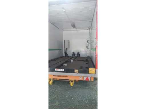 Kampa Schwerlastanhänger 12 t Typ. Achtung Überbreite! Für Transporthöhe wird Tiefbett Anhänger benötigt! Zuladung ca. 9 t (Aufbau ca. 3 t) Der Aufbau von Moeyersons und der Einbau von Joloda Hydraroll wurde speziell entwickelt um Batterien für den Audi E-Tron automatisch auf das Montageband zu verbringen.