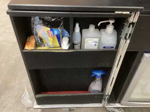 Rollbar mit Lenkrollen, Fächer teilweise mit Inhalt, Kaffeemaschine kann eingebaut werden, Musik-Spieler