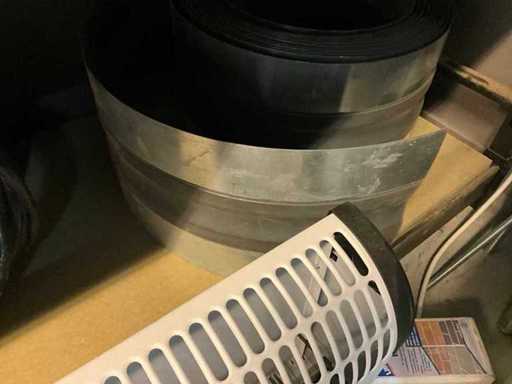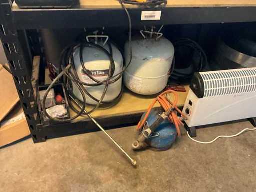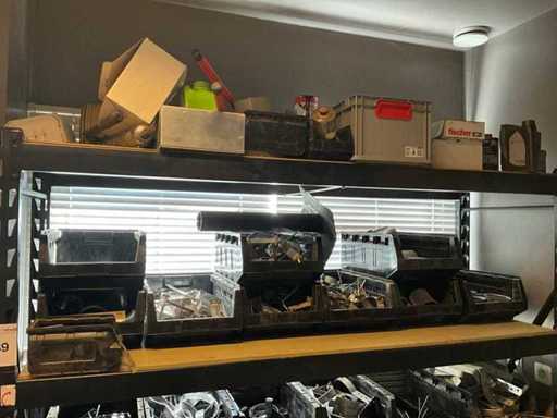 Lagerhalter bestehend aus 2x Stativ 60x200 cm, 8x Balkenbreite 180 cm, Inhalt bestehend aus Behältern mit Haltern für Dachwasserabflüsse, Gasbrenner, Kontaktklebesprüher für EPDM mit 2x Klebedruckbehälter, elektrischer Heizung, Zinkausdehnung usw.