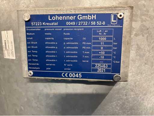 Maschinen-Nr. 225463, Inhalt max. 1000 Liter, Druck max. ca. 11 bar (Der Artikel ist im Zustand wie vorhanden und ungeprüft. Der Artikel wird ab Fundament verkauft!)