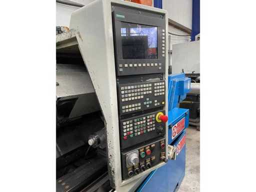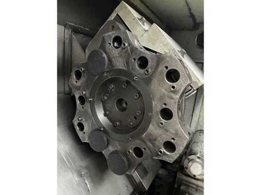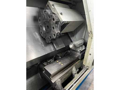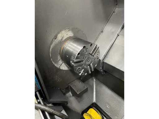 3-Achs-CNC-Drehbank für Dreh- und Fräsarbeiten mit motorisierten Werkzeugen. Die Maschine ist mit einem VDI-Turm mit rotierenden Werkzeugen ausgestattet und wird mit einem hydraulischen Stabzuführer geliefert.
