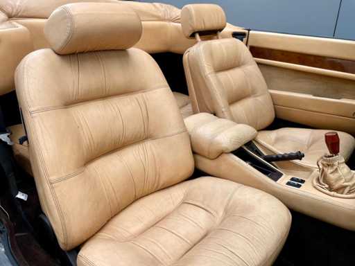 Beiges Maserati-Vollleder mit schöner Patina. Vollständig, inklusive Rücksitze. Die Sitze und Türverkleidungen wirken gepflegt, weisen jedoch typische Alterungsspuren auf.