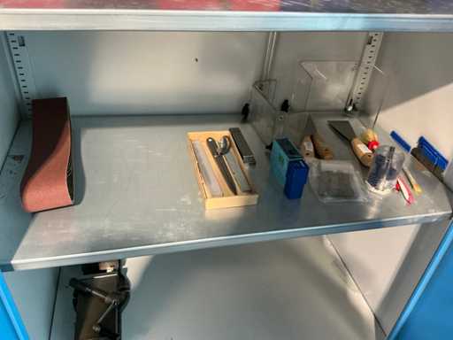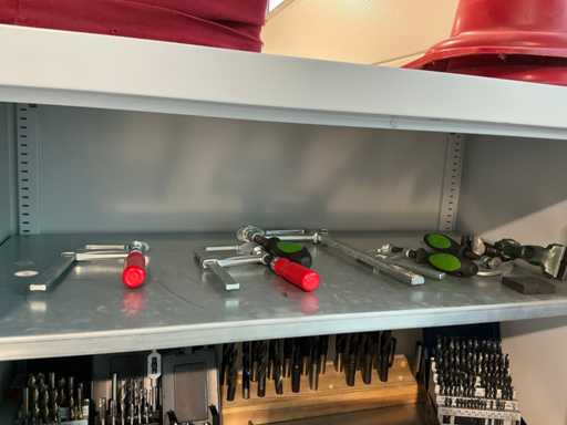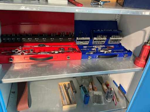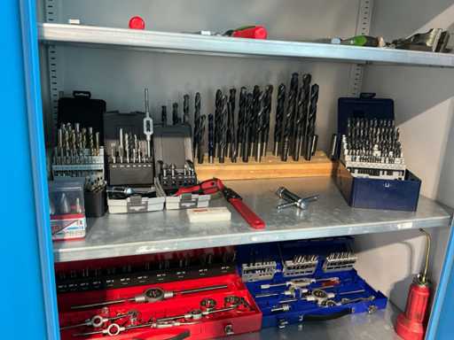 2 Drehflügeltüren, 4 Fachböden, mit Inhalt (div. Bohrer, Gewindebohrer, Gewindeschneider, Schraubzwingen, Messwerkzeuge, Maschinenschraubstock)