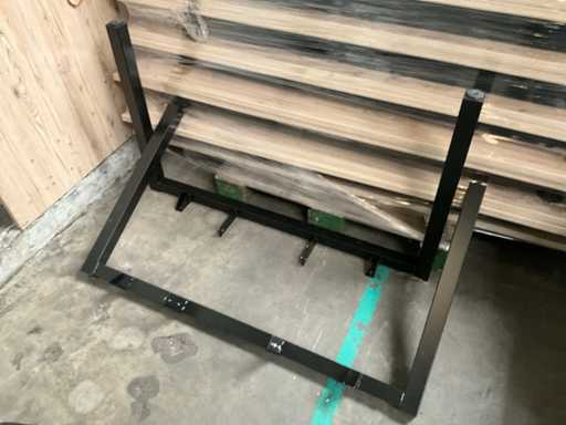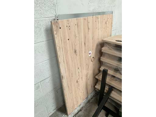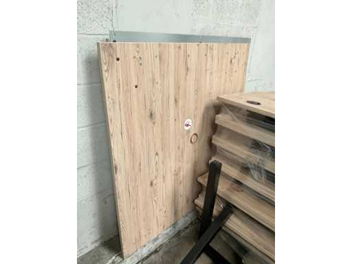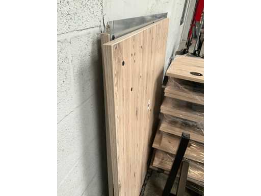 Gebaut auf einem Metallsockel, mit einer Holzplatte 120 x 120 cm, komplett mit dito Arbeitsplatte, die bei Bedarf aneinander befestigt werden können und so doppelte Abmessungen mit Verstärkung erhalten. Nur mit 2 umgekehrten U-förmigen Beinen aus Metall ausgestattet.