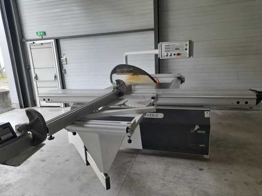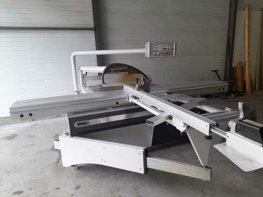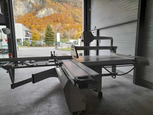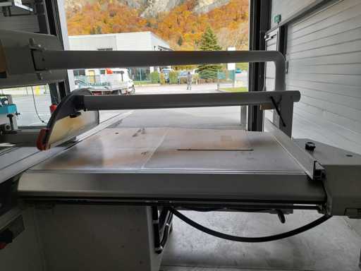 Dreiphasen-Schiebetischsäge mit integrierter Ritzung und digitalem motorisiertem Parallelanschlag.
