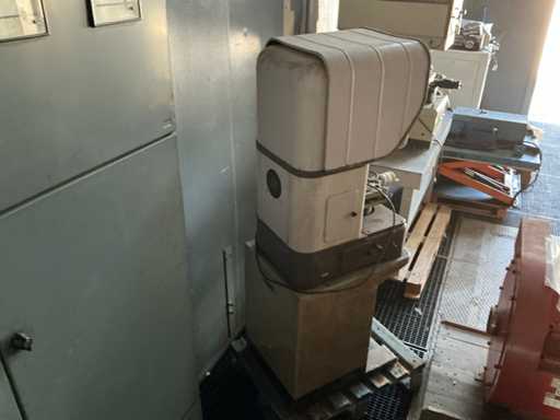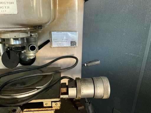 Optische Messgeräte mit Projektionsleinwand und Koordinatentabelle, verwendet für die Maßinspektion und Überprüfung bearbeiteter Teile. Beinhaltet Lichtsystem sowie Fokus- und Shift-Regler.