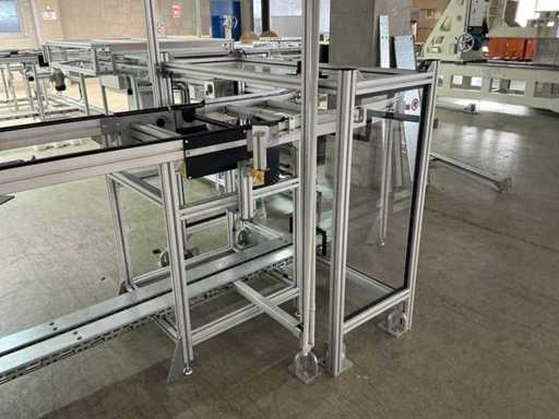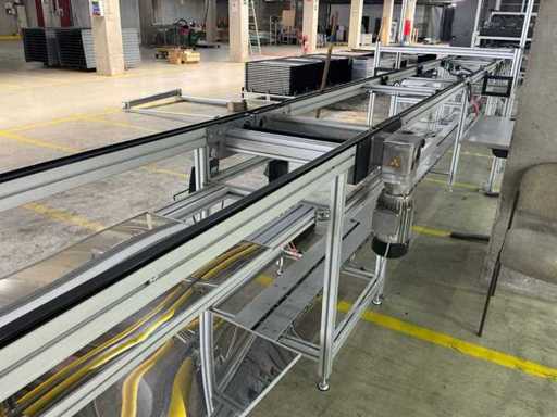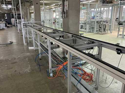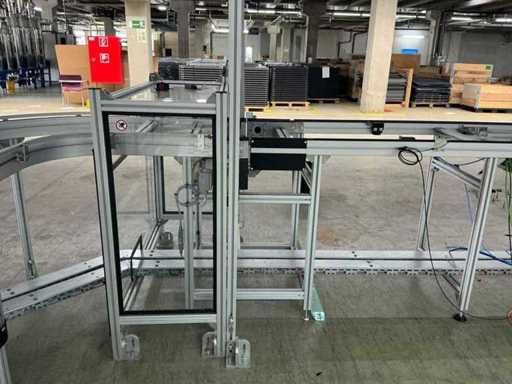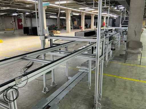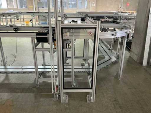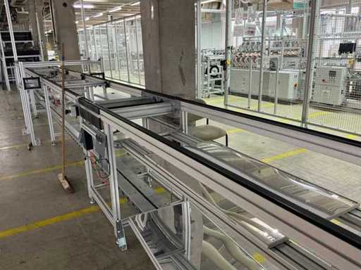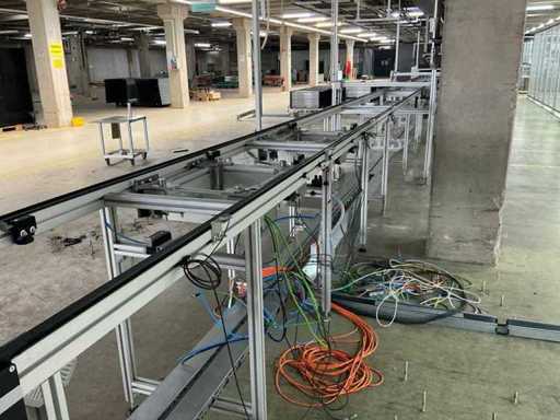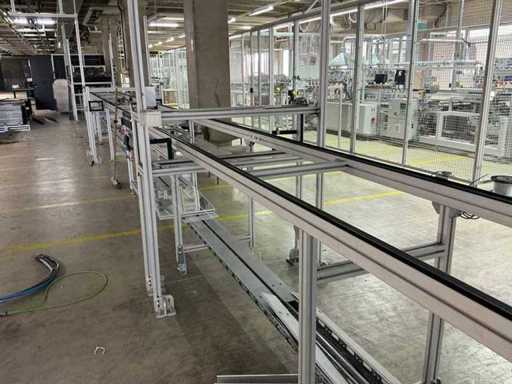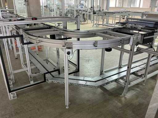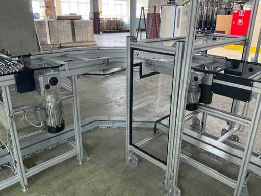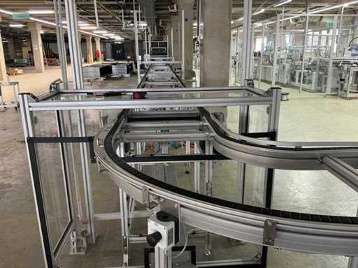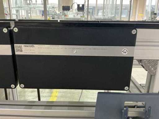 Bestehend aus 1x REXROTH 3842998098 Curve inkl. Antrieb und 1x REXROTH 3842999721 Drive Module inkl. Antrieb jeweils auf ITEM-Gestell, Abmaße REXROTH Drive Module 8500x650x1060 mm mit Bandbreite 640 mm, Abmaße REXROTH Curve 1550x1680x1060 mm mit Bandbreite 650 mm