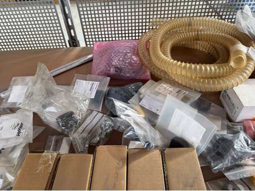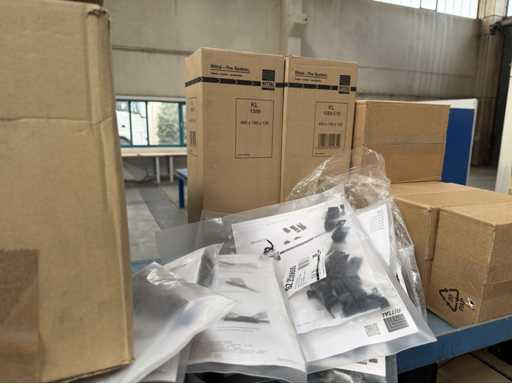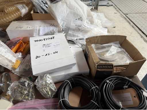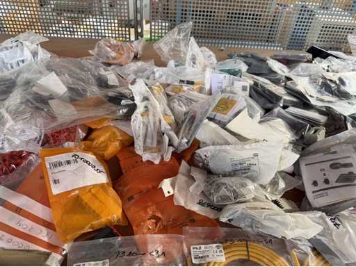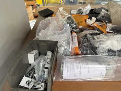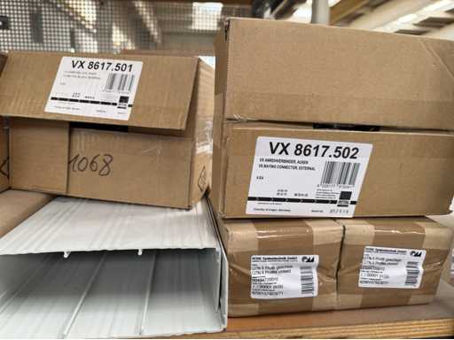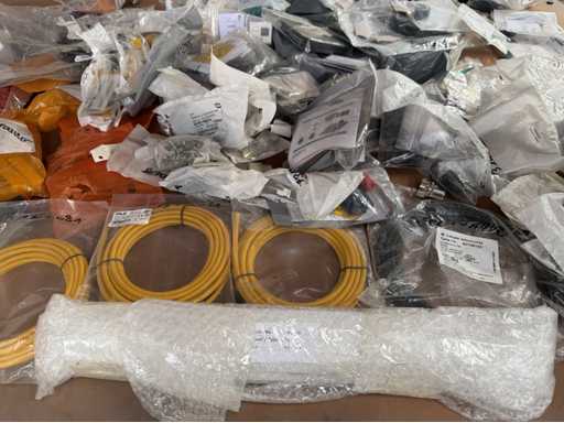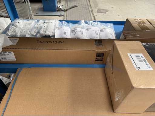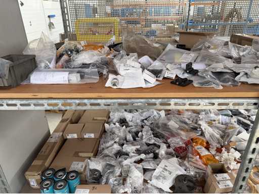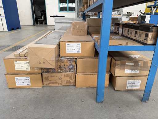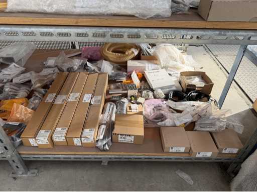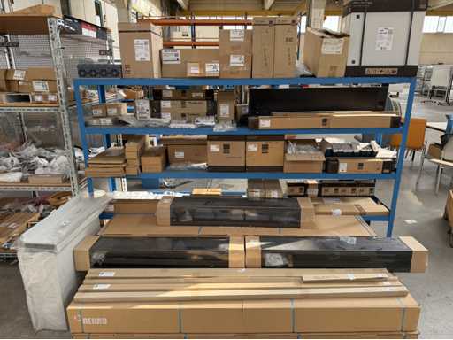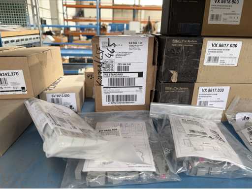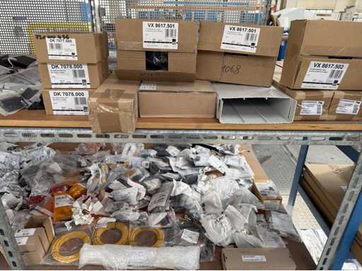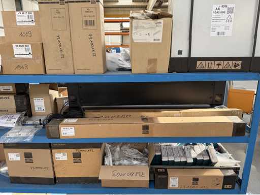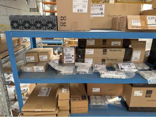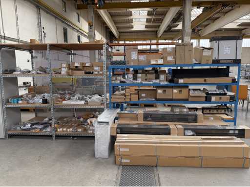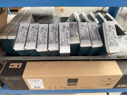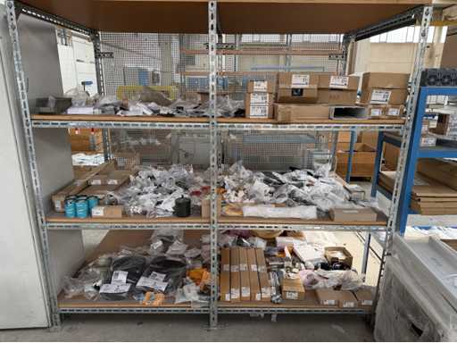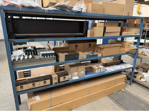 Zwei Regale mit Montagematerial; überwiegend Fabrikat Rittal: Scharniere, Kabel,Luftaustrittsfilter, Encoder,Chasses,Kabelschellen,Druckknöpfe,Bodenbleche,Systemleuchte,Verdrahtungskanäle etc.; weitere Details siehe Fotos der Typenschilder