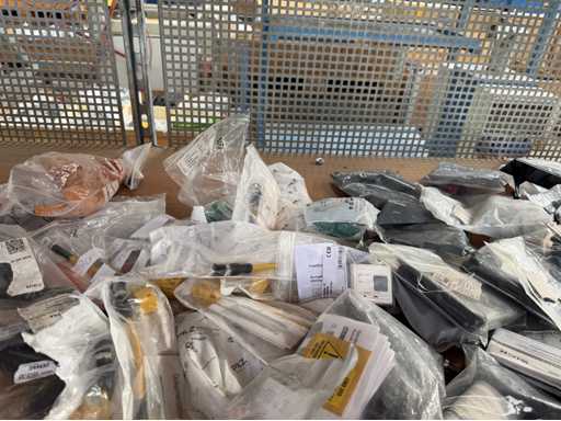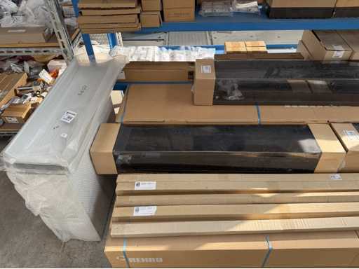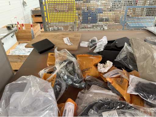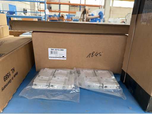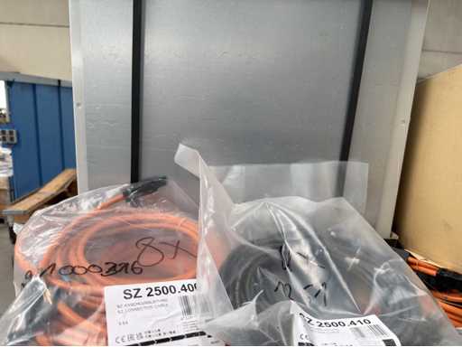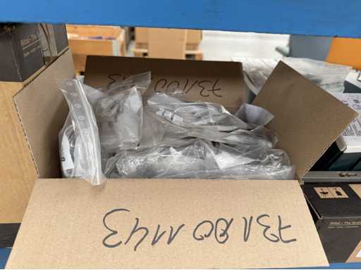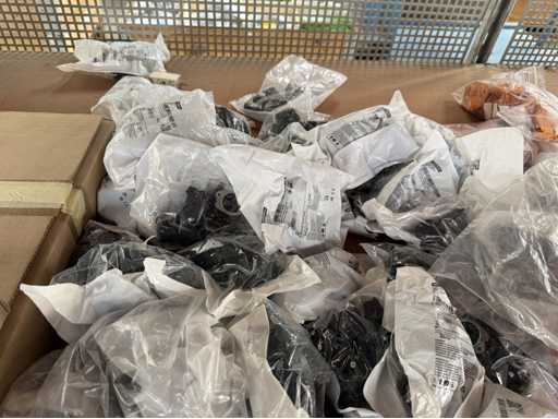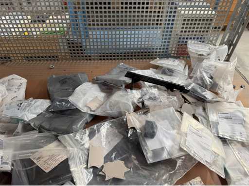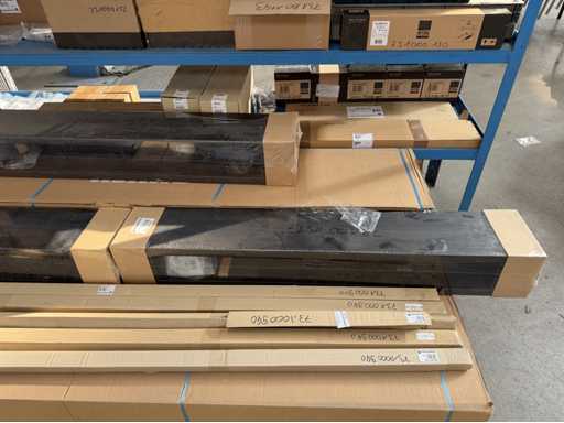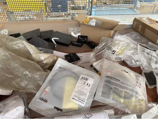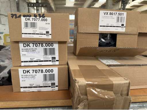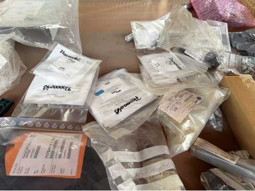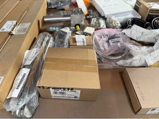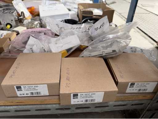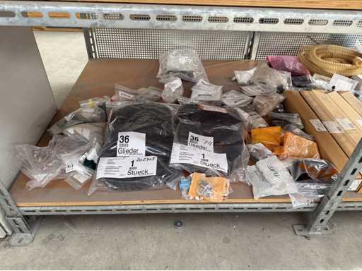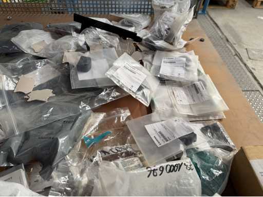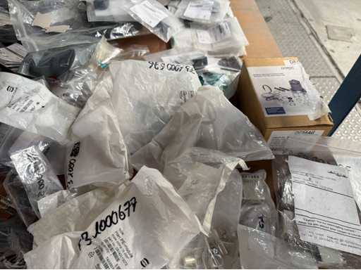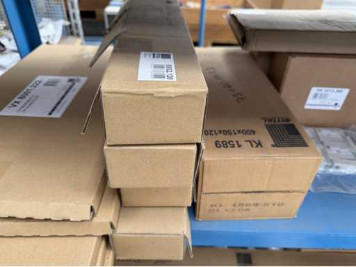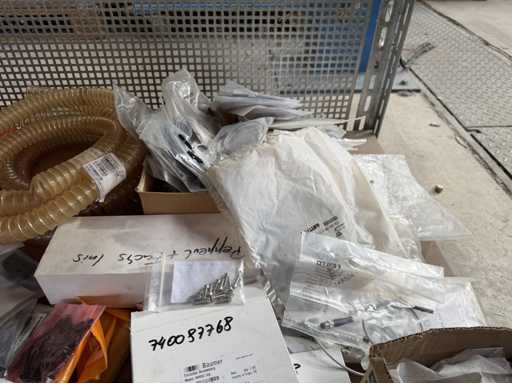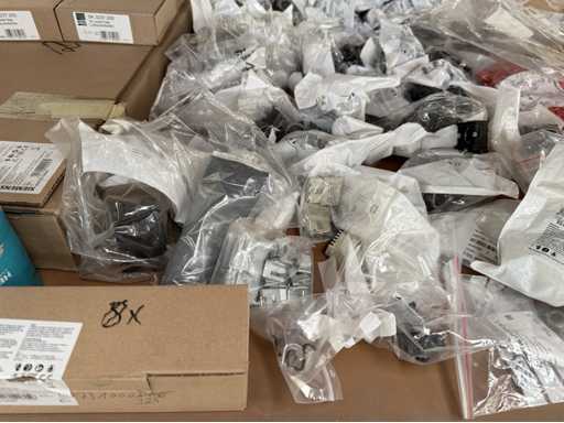 Zwei Regale mit Montagematerial; überwiegend Fabrikat Rittal: Scharniere, Kabel,Luftaustrittsfilter, Encoder,Chasses,Kabelschellen,Druckknöpfe,Bodenbleche,Systemleuchte,Verdrahtungskanäle etc.; weitere Details siehe Fotos der Typenschilder