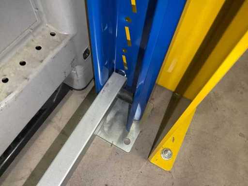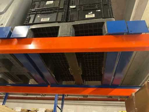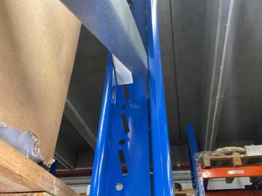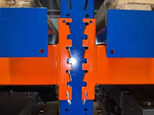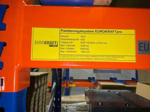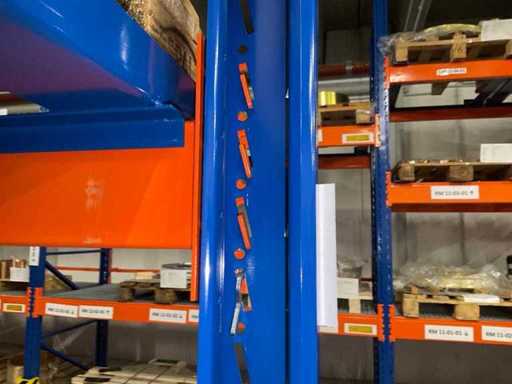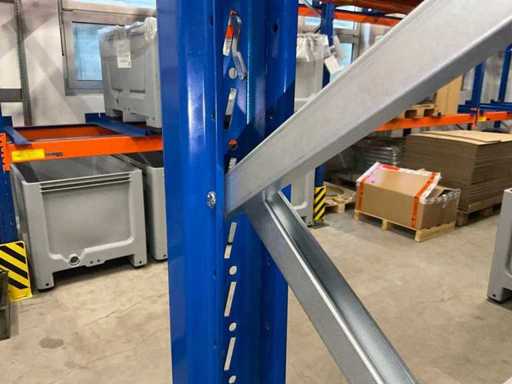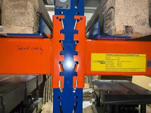 1 Schwerlastregal bestehend aus 4 Ständern, ca. 1100x3400 mm, 12 Traversen, ca. 2700 mm, ohne Inhalt, inkl. Paletteneinschübe