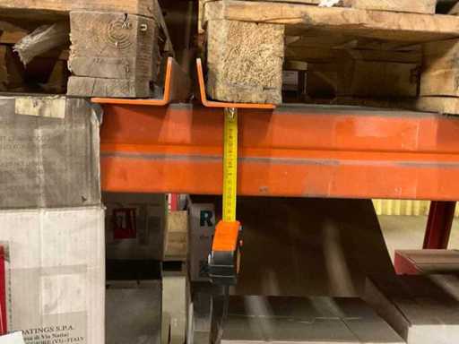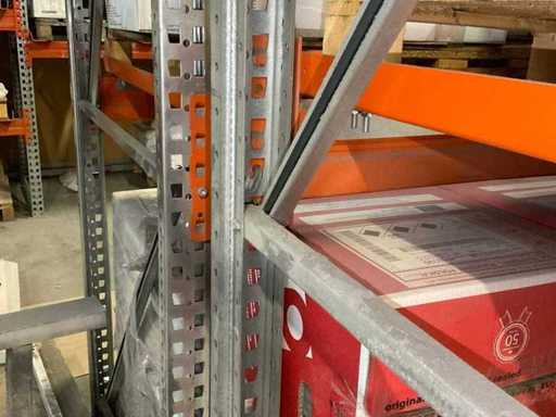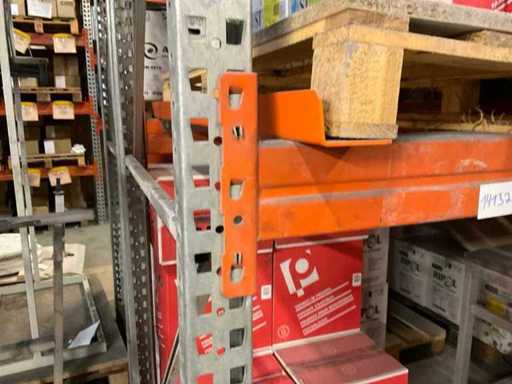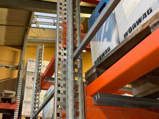 Schwerlastregal bestehend aus: 2 Ständer ca. 1100x3300mm, 6 Traversen ca. 3600mm, inkl. Palettenaufnahmen, mit Inhalt