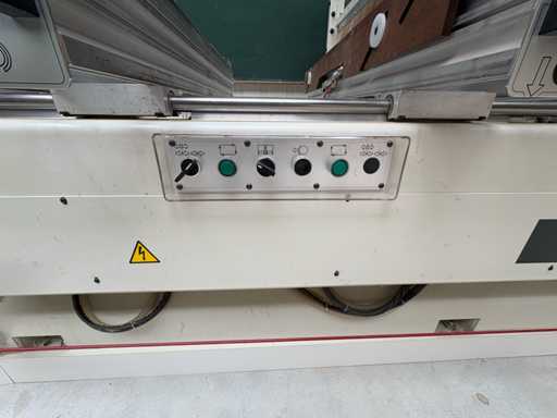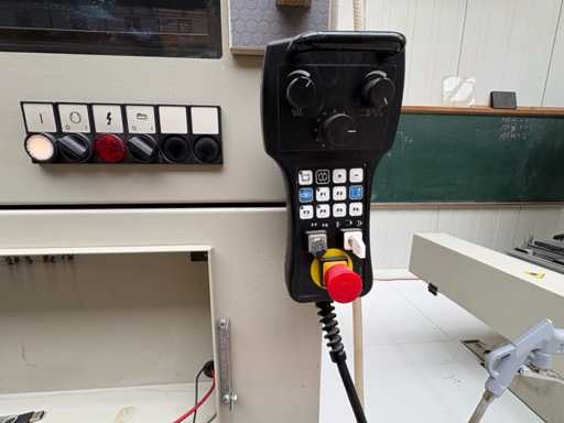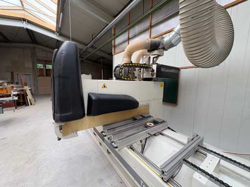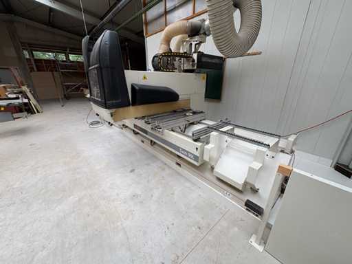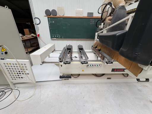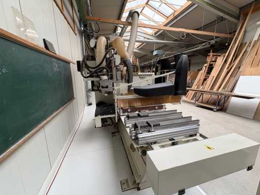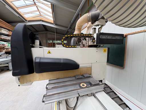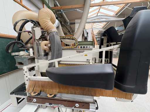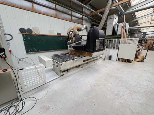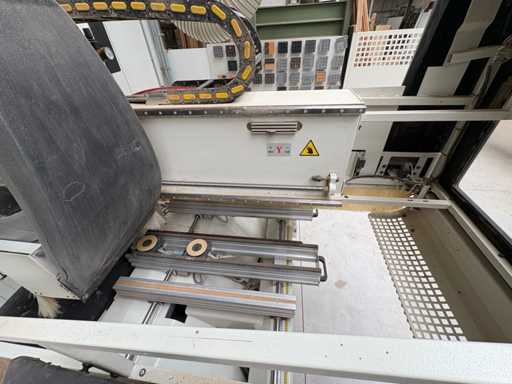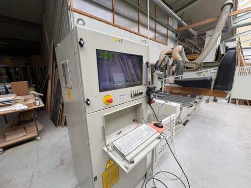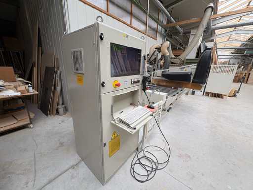 Technische Daten: Bearbeitungsbereich: 2980 (3780) x 1200 x 100 mm Spindel: HSK63F, 6,6 kW Werkzeugwechsler: 4-fach (mitfahrend) + 7-fach (stationär) Nutaggregat: 2,2 kW, Ø 200 mm Sägeblatt Bohrkopf: 14 vertikale + 6 horizontale Bohrspindeln Sägeblatt 200mm Absauganschluss vorhanden Steuerpult mit Monitor, Not-Aus, Tastatur Besonderheit: Hardware wurde vor ca. 5 Jahren erneuert Zustand: Gebraucht, voll funktionsfähig Abbau/ Demontage erfolgt durch Käufer oder gegen Aufpreis durch Verkäufer