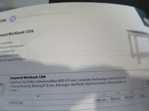 Siegmund-Werkbank Lochplatte aus hochwertigem Stahl S355J2+N + Plasmanitrierung - 16 mm Bohrung - Bohrungen im 50x50 mm Raster - Materialstärke ca. 12 mm - höhenverstellbar von 800 bis 975 mm - Gestell aus Aluminiumprofilen Tischlänge 1200 mm Tischbreite 800 mm Tischhöhe 800-975 mm Tischbelastung 250 Kg Maschinengewicht ca. 108 Kg Abmessungen L x B x H 1,2 x 0,8 x 0,85 m Zustand: nie benutzt / neu (5)