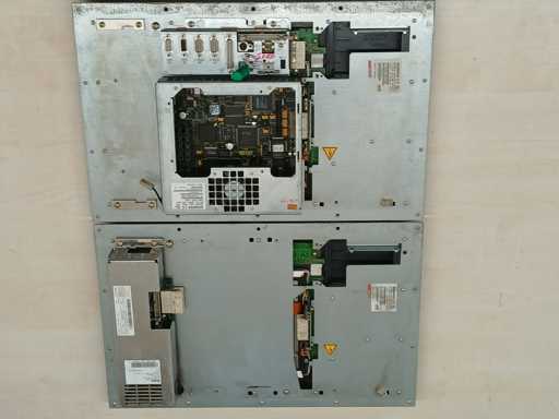 2X Siemens SINUMERIK OP031 Bedientafeln, die für SINUMERIK 840D CNC-Steuerungssysteme entwickelt wurden. Die Tafeln sind mit 10,4" TFT-Farbdisplays und integrierten CNC-Bedienertastaturen mit Softkeys ausgestattet. Die Rückseite enthält serienmäßige industrielle Schnittstellen und Stromversorgungsmodule. Einheiten.