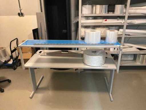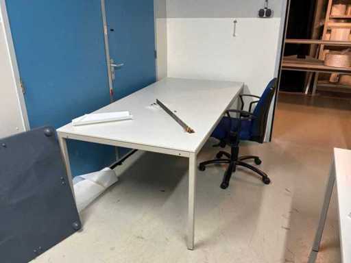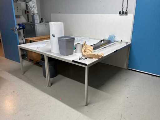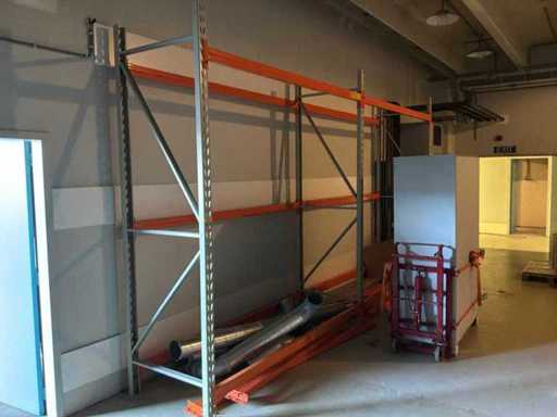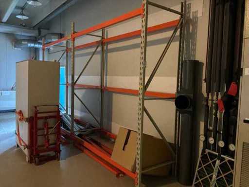 3x Bürotische, 2 große Regale mit maximaler Größe von: (W375cm x D90cm), 2x Regalregale, von denen Inhalt nicht enthalten ist.