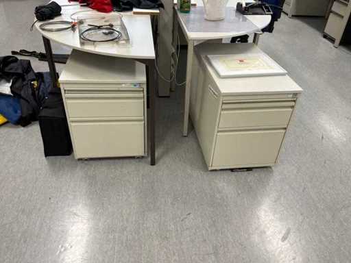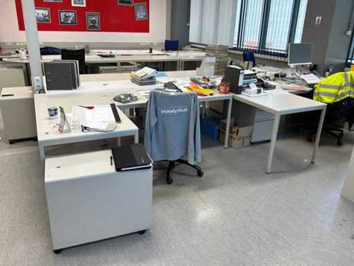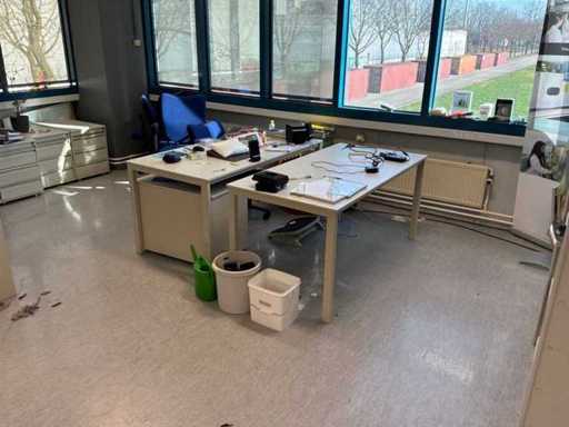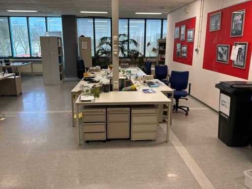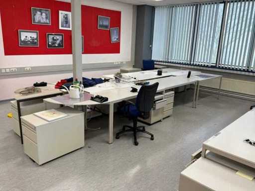 20x Bürotische, 30 Basisschränke, 4x Aktenschrank, 14 Bürostühle, 1 Pflanzgefäß mit Pflanze.