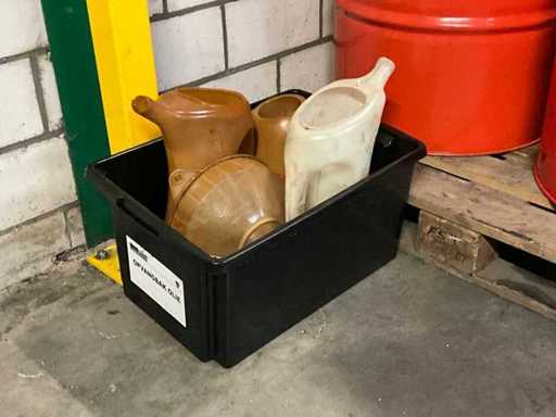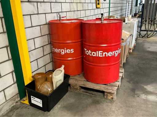 2x geöffneten Lauf; insgesamt etwa 250 Liter; darunter verschiedene Ölkannen aus Kunststoff; ohne Palette;