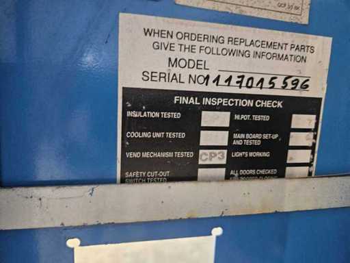 Die Maschine ist komplett, ohne Münzakzeptor, das Mainboard ist funktionsfähig, die Kühlung ist nicht getestet, es kann ein Kompressor- oder Lüfteraustausch erforderlich sein, es gibt ein Schloss und Schlüssel