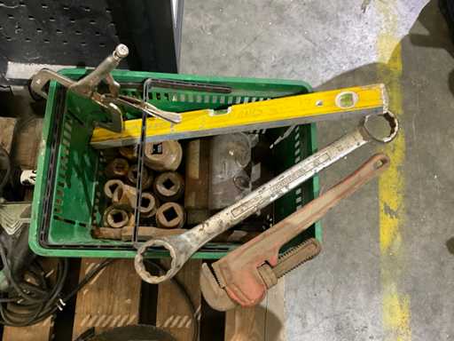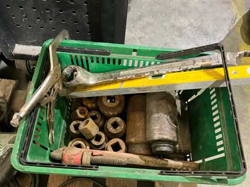 Dazu gehören etwa 13 verschiedene große Steckschlüssel, verschiedene Schraubenschlüssel/Muttern und Wasserwaage