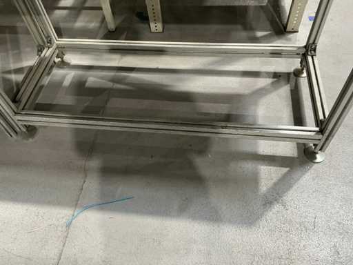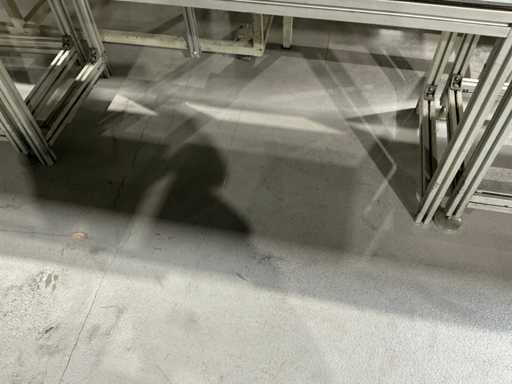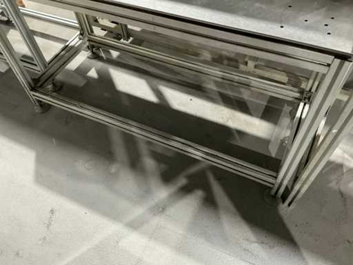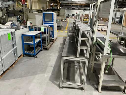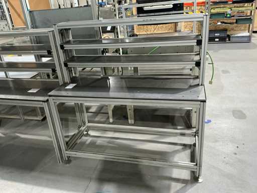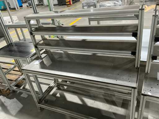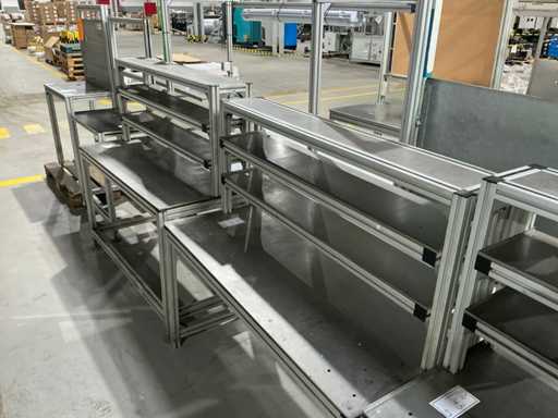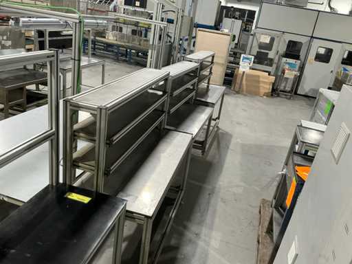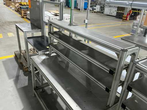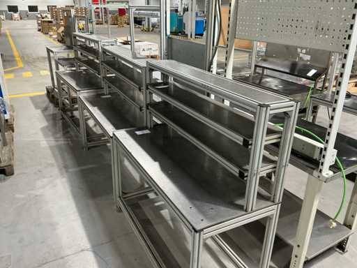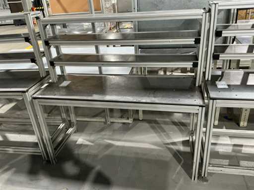Satz von 3 Arbeitstischen, jeder mit verstärkter Struktur und drei oberen Regalen zur Organisation von Materialien, Werkzeugen oder Komponenten ausgestattet. Die Tische sind für den Einsatz in Produktionslinien, Fließbanden und Lagern konzipiert und zeichnen sich durch ihre Robustheit und große nutzbare Fläche aus.