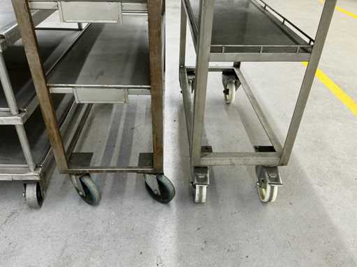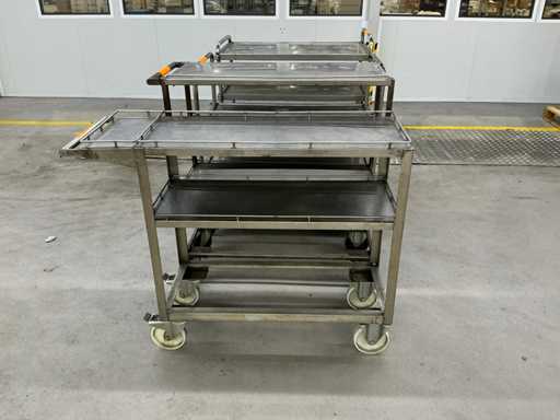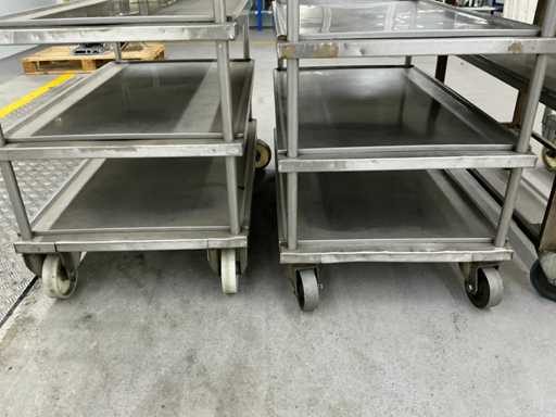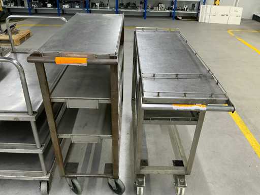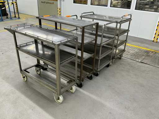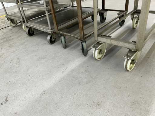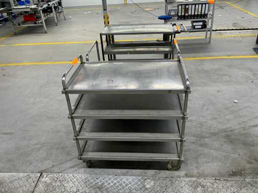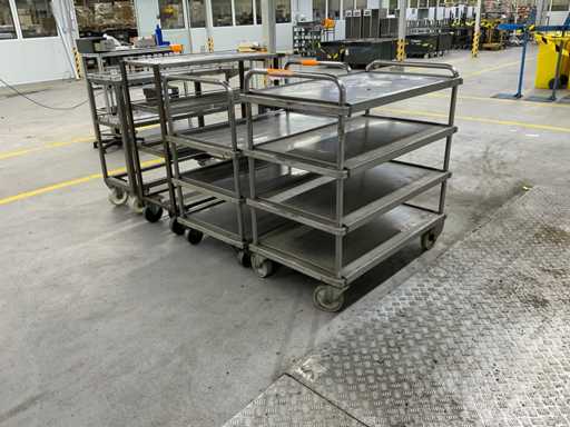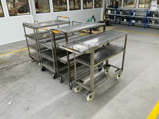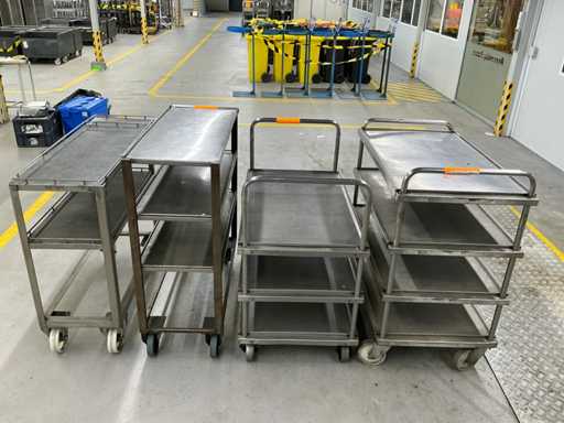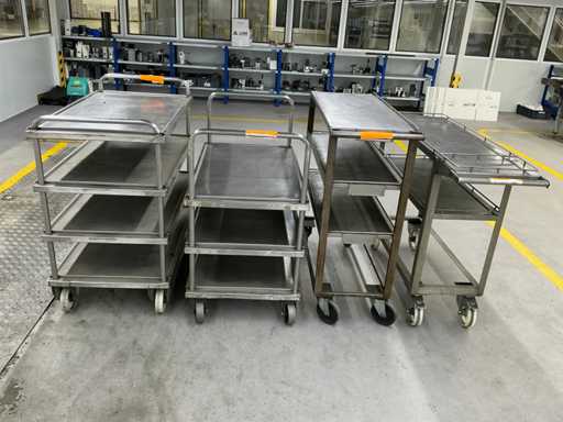Das Grundstück besteht aus 4 Metallservicewagen für Werkstatt oder Lager, mit geschweißter Struktur, Drehrädern und flachen Regalen für die Handhabung von Teilen oder Werkzeugen.