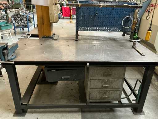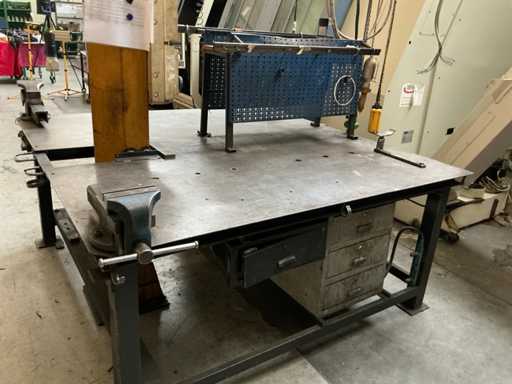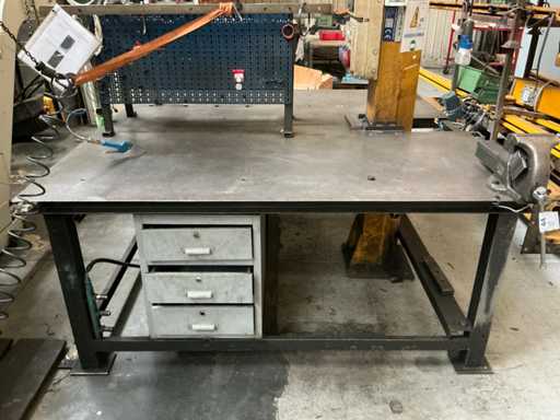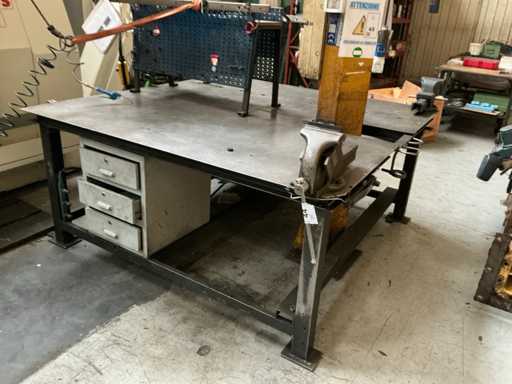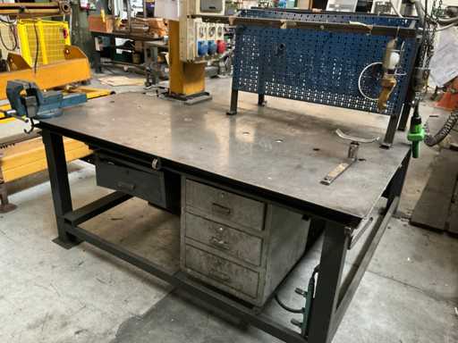 Schmiedeeisenwerkbank mit Schraubzwingern und kleiner Kommode geliefert