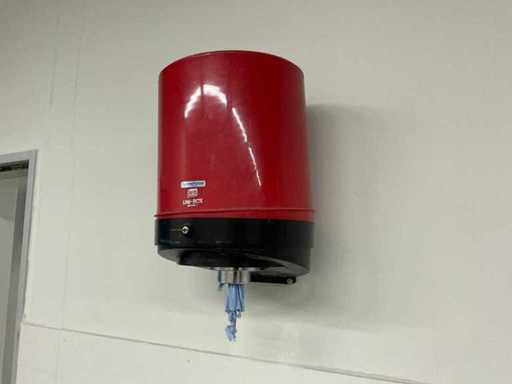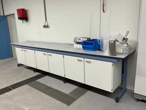 Raum bestehend aus: Arbeitstisch mit Schränken 420x75x94 cm, Handtuchspender, Arbeitsschrank 120x40x205 cm an der Wand montiert, Waschbecken 180x75x94 cm ohne Wasserhähne, Handtuchspender, Gegenstände auf dem Tisch, Schrank 52x55x72 cm.