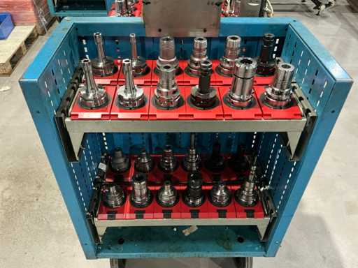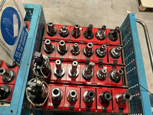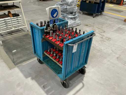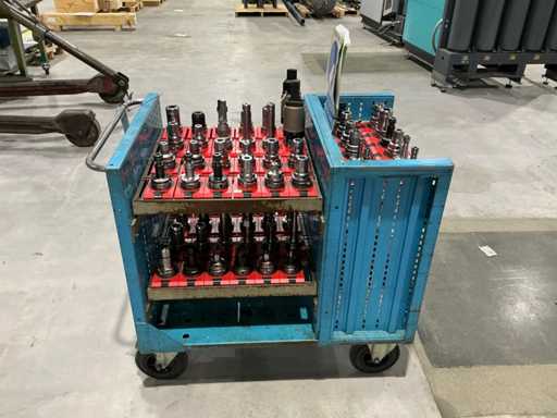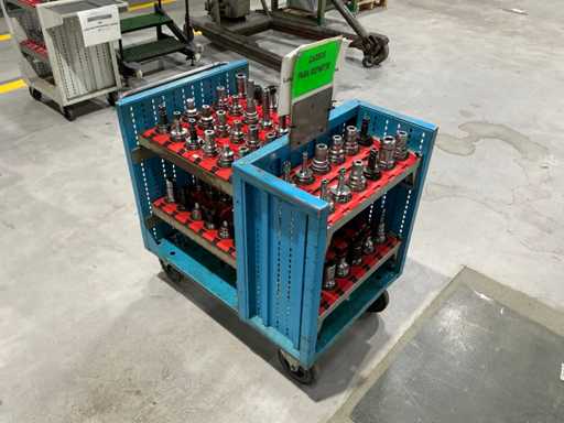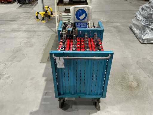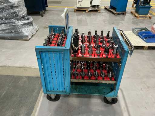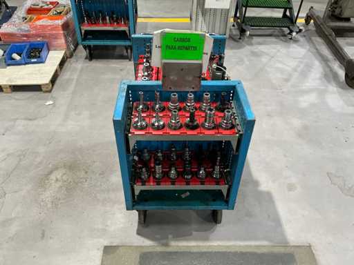 Zusammensetzung: Verschiedene konische Werkzeughalter, montiert auf einem Metalltransportwagen.