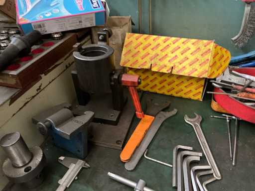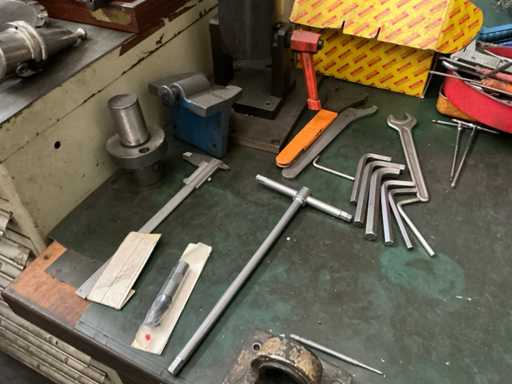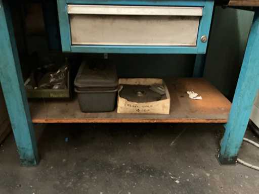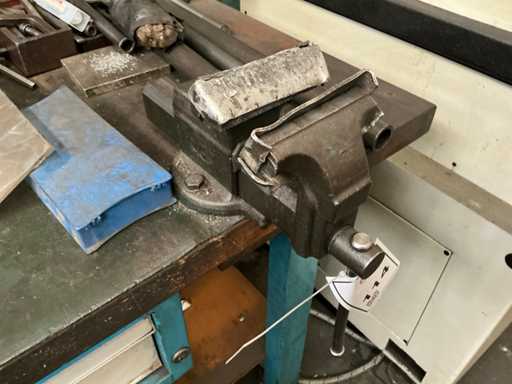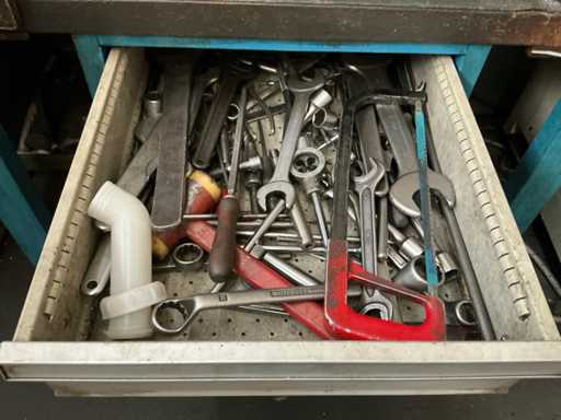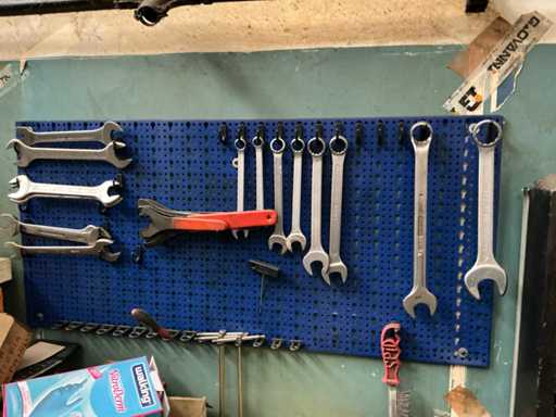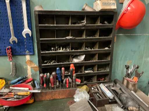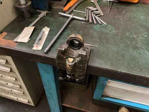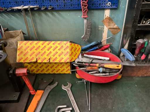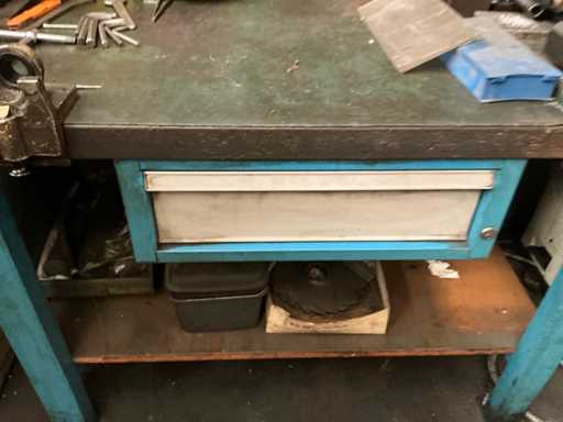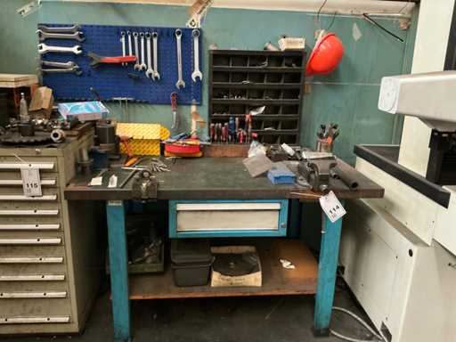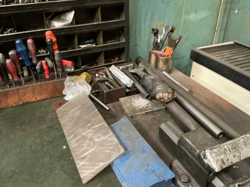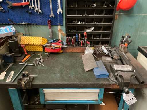 Werkbank mit verschiedenen Inhalten wie Werkzeugen und Schrauben.