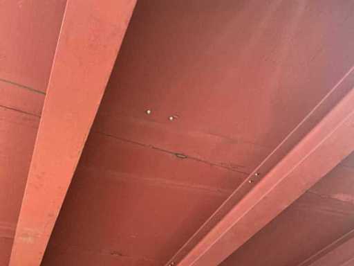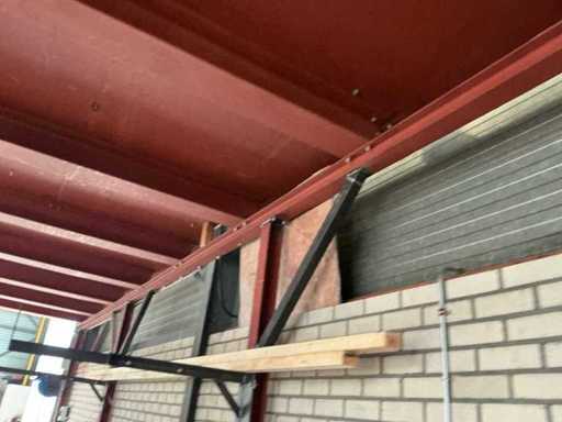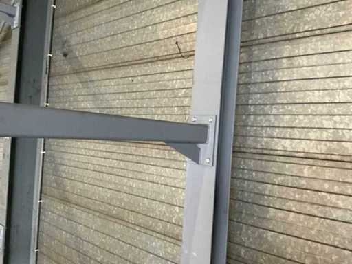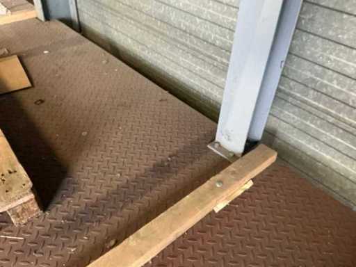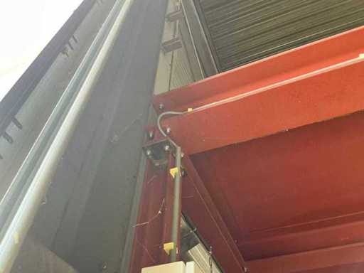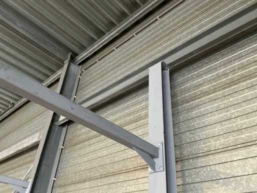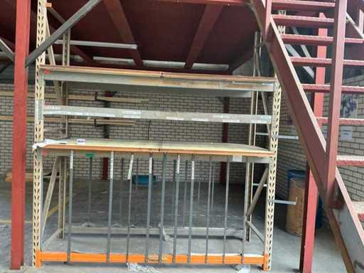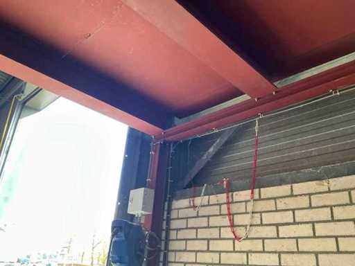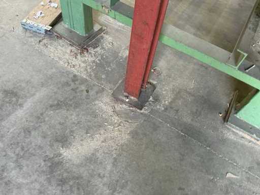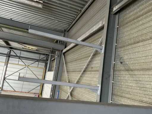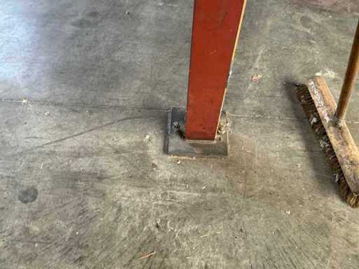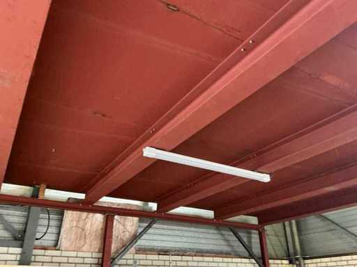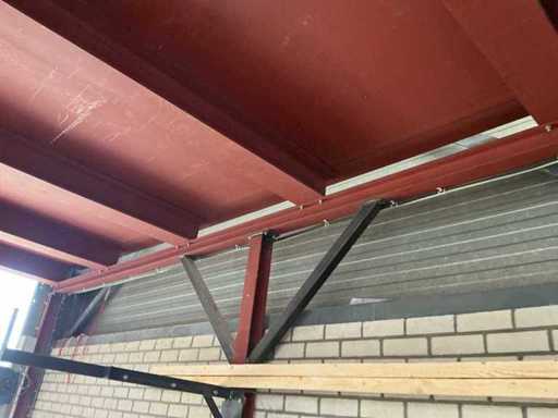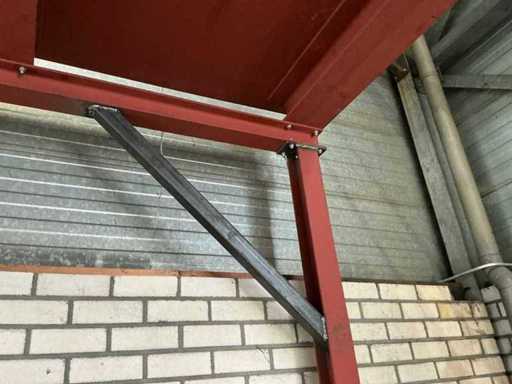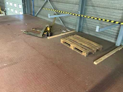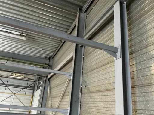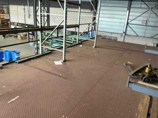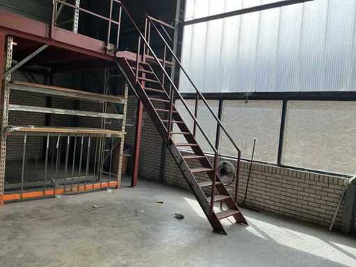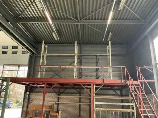 Bodengröße etwa 10x5 Meter, Bodenhöhe 3,4 Meter, größtenteils geschweißte Konstruktion, einschließlich 1x Hakenhalter auf dem Boden, 1x Hakenhalter im Erdgeschoss und 1x Auslegergestell auf dem Zwischengeschoss, lose angebaute Treppe (nicht in Maßen angegeben, Käufer muss Gewindestäbe im Boden schleifen