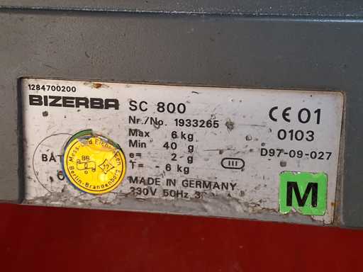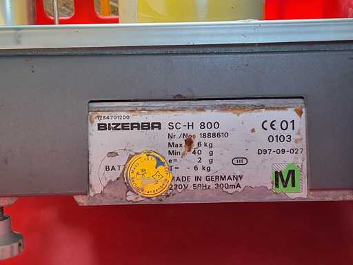 2 BIZERBA SC-H800 weegschalen met accessoires, 1 trolley met 2 Bizerba SC-800 weegschalen, 40g - 6 kg, functie ongetest!