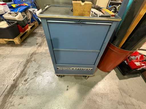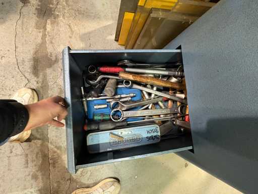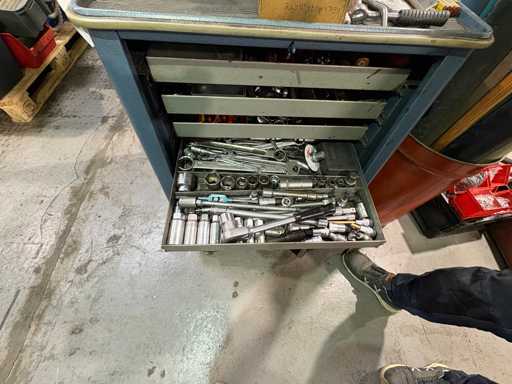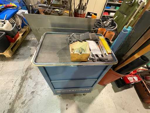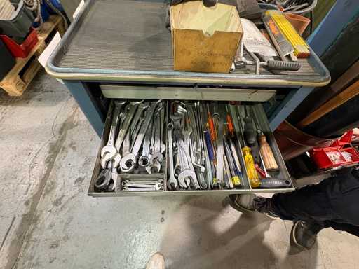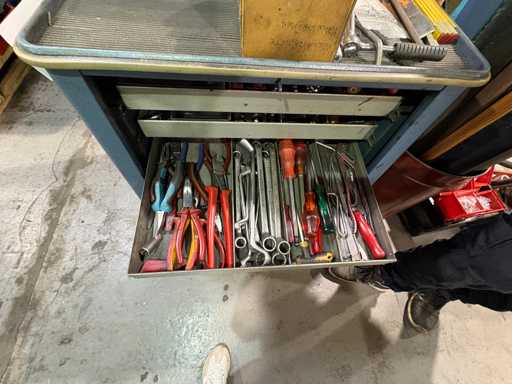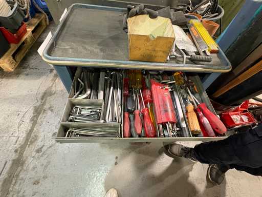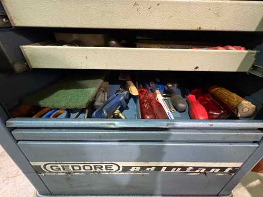 Fabrikant: Gedore Model: De Trolley van het adjudanthulpmiddel Uitvoering: verrijdbare gereedschapswagen met meerdere lades Inhoud: gemengd assortiment handgereedschap (voorbeeldfoto's) Ring- en steeksleutels Ratels & doppen (verschillende maten) Schroevendraaier Sets Tangen, hamers, inbussleutels Kleine onderdelen en diverse accessoires Conditie: Gereedschapswagen: robuust, gebruikssporen, functioneel Inhoud gereedschap: gemengd, gebruikt, deels complete sets, deels enkelstuks Let op: Inhoud varieert, foto's als voorbeeld