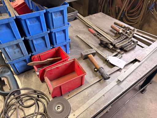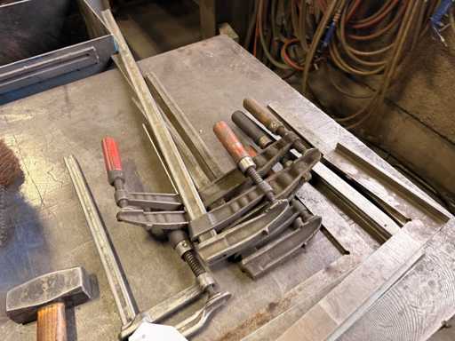 De inhoud bestaat uit verschillende schroefklemmen, hoeken en handapparaten