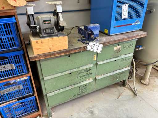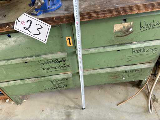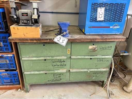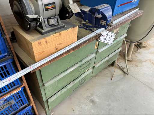 Werkbank met lades, werkblad ca. 1300 x 700 mm, werkhoogte ca. 840 mm, dubbele bankslijp, in plaats van 125 mm (Het artikel is in staat zoals bestaande en niet gecontroleerd. De kosten voor demontage en laden zijn bindend en het item wordt verkocht zonder inhoud/materiaal!)