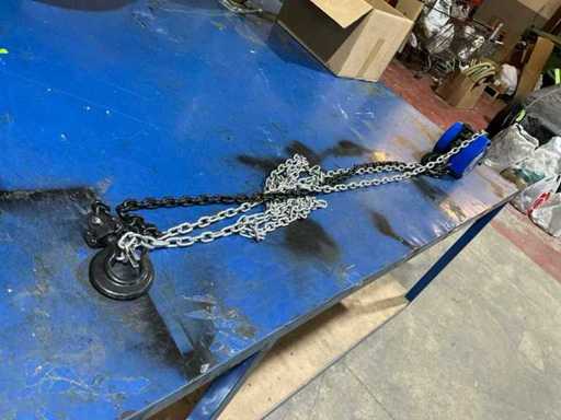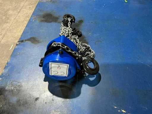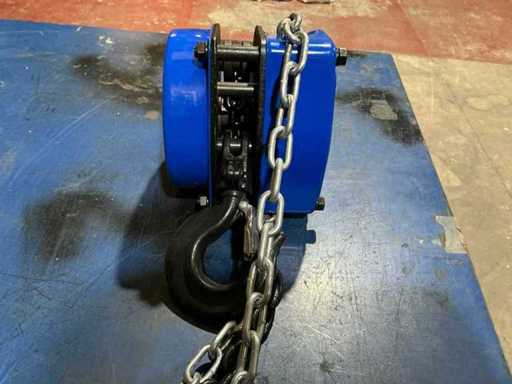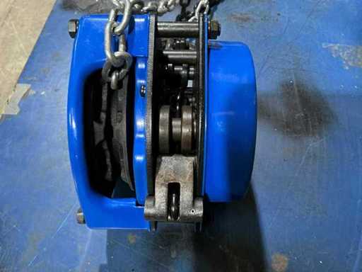 Blue-painted steel construction with safety hook, load chain and hand chain operation. Dimensions approx. 20 x 15 x 20 cm.