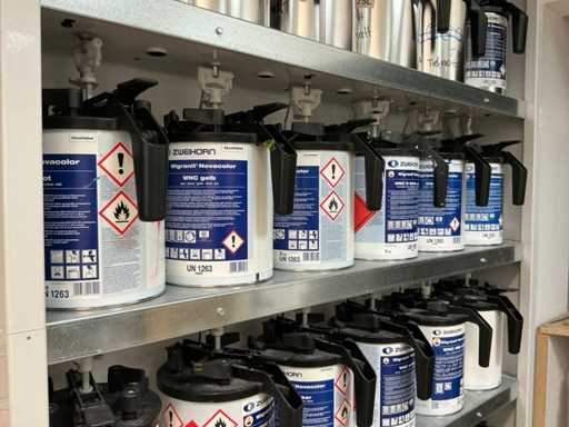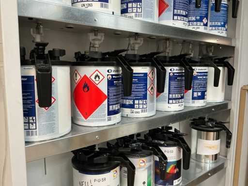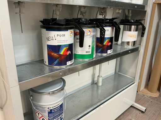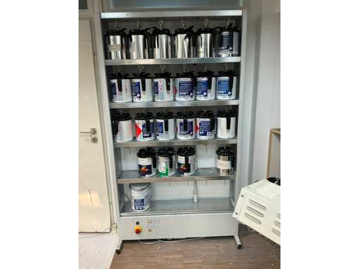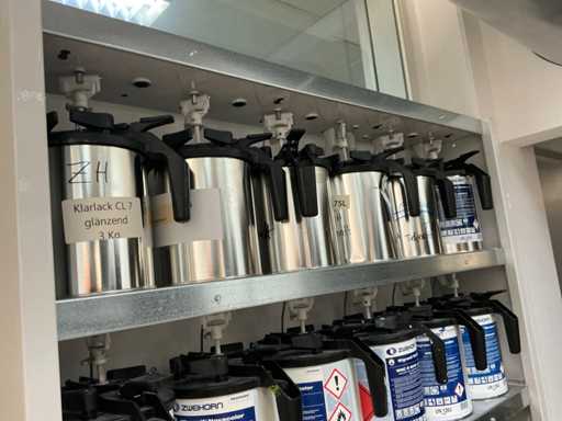 Voor oplosmiddelverf, alle RAL-kleuren, 30 mengstations voor 3 kg blikjes, inclusief mengdeksel, en de software Zweihorn wordt toegevoegd. Zichtbare kleuren zijn het vervoer van gevaarlijke goederen.