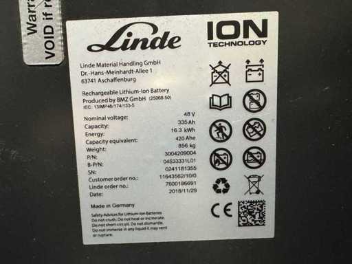 Accu: 29/11/2018 Li-ION BG3.1 48V/335Ah/16,3 kWh, met zeer goede prestaties; gemeten met 51,1V