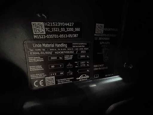 2021 Service + UVV 01/2027 Linde E30HL 3.000kg Triplex 513cm 3.+4. Vorkversteller Scale elektrische heftruck 8,726 uur