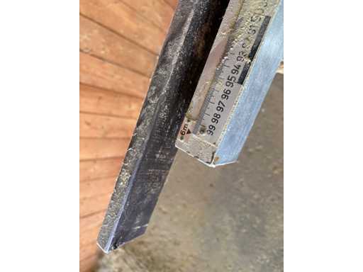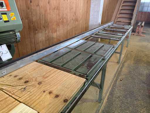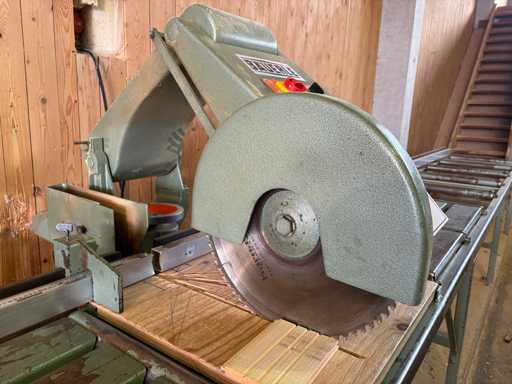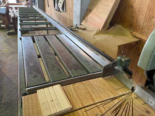 Motorvermogen 3,7 kW, 380 V, zaaglengte ca. 600 mm, zaageenheid 45° zwenkbaar (eenzijdig), rollenbaan links ca. 6000 mm met aanslag, rollenbaan rechts ca. 4000 mm, rolbreedte ca. 600 mm