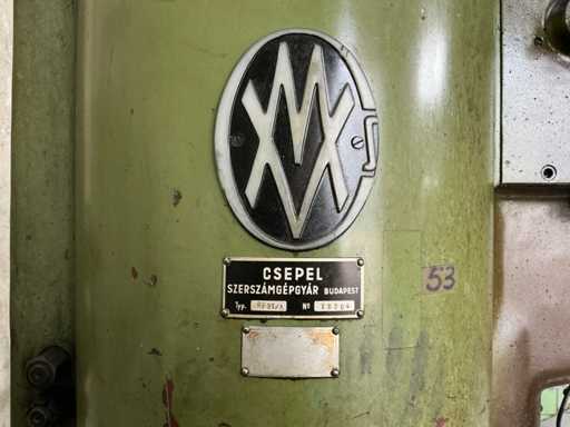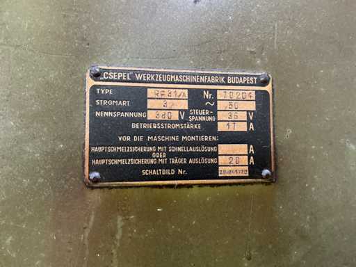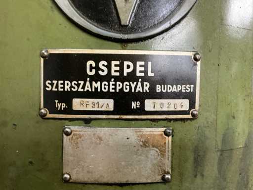 De Csepel RF 31/A is een in Hongarije gemaakte radiale boormachine die is ontworpen voor zwaar boorwerk op grote werkstukken. De belangrijkste technische gegevens gebaseerd op het RF 31-model, dat vrijwel identiek is aan de RF 31/A-variant: Specificaties – Csepel RF 31 Bordiameter in staal: tot 60 mm Armlengte: 1750 mm Tafelgrootte: 700 × 700 mm Spilsnelheid: 19 – 1900 tpm (meertraps) Spilhouder: MK5 (Morse taps 5) Motorvermogen: ca. 4 kW Machineafmetingen (L × W × H): ca. 3000 × 1100 × 3700 mm Machinegewicht: ca. 7.000 kg Speciale kenmerken: Grote hals voor omvangrijke werkstukken Hoogteverstelbare boorarm Koelvloeistofapparaat (optioneel) Robuuste gietconstructie voor hoge stabiliteit Ideaal voor werkplaatsen in werktuigbouwkunde en staalconstructie