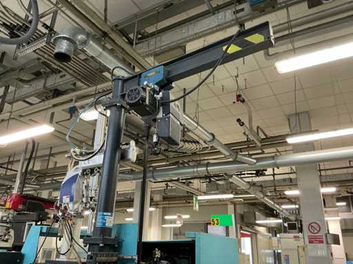 YASHIN-manipulator Met DEMAG-fokkraan en takel met een capaciteit van 500 kg en ongeveer 1500 mm bereik.