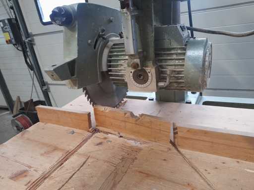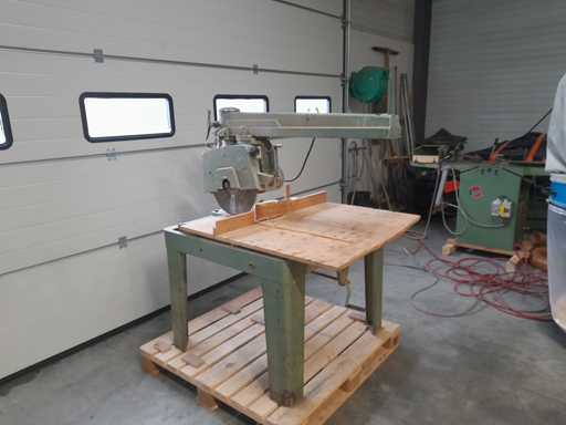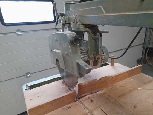 Een metalen frame gemonteerde radiaalzaag met een schuifsnijwagen.