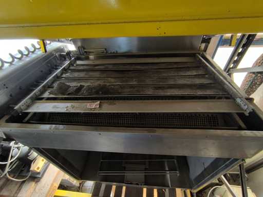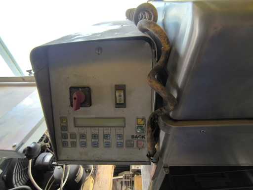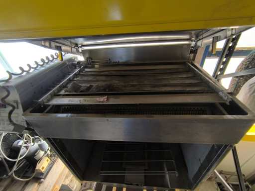 Commerciële donutfriteuse met meerdere braadrijen, automatisch hef-/daalsysteem, digitaal bedieningspaneel met tijd- en temperatuurinstellingen. Roestvrijstalen behuizing.