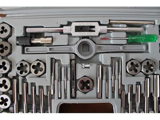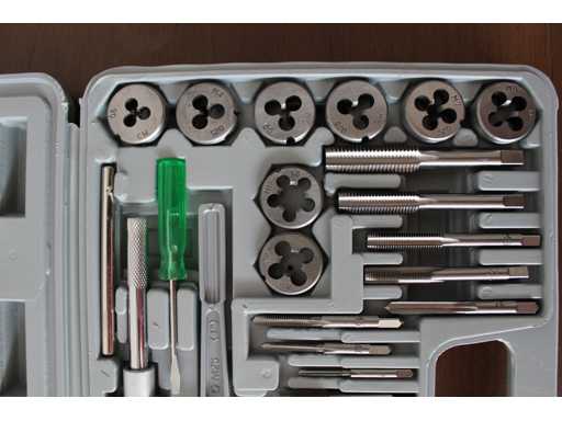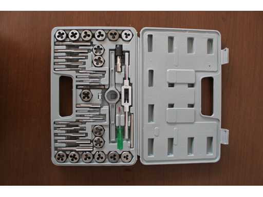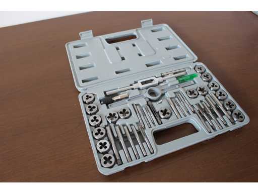 TAPS EN MATRIJZEN ZIJN 40 STUKS GEZET. Professioneel set gemaakt van warmtebehandeld staallegering. Taps en matrijzen geschikt voor het maken van schroefdraad op zacht staal en aluminium. Geleverd met een sleutel voor tikken en tikken. Beschermingscase voor transport en om ze altijd in orde te hebben.