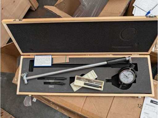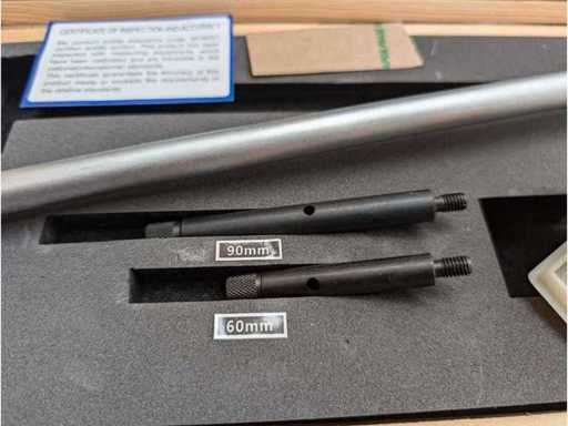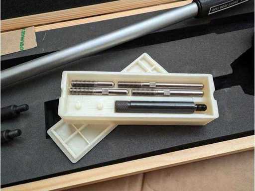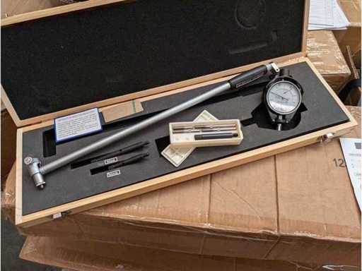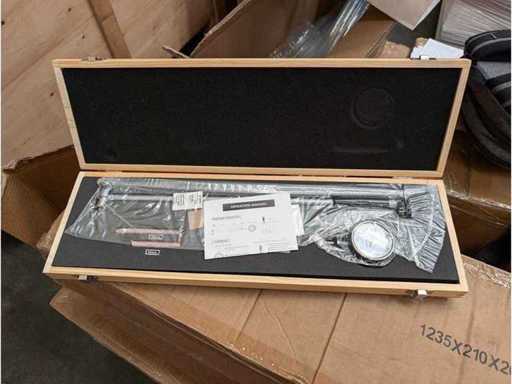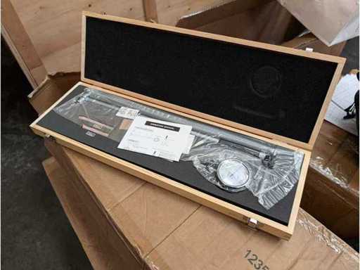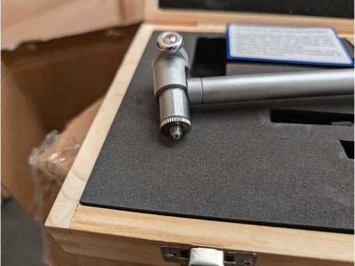 Precisieboring met twee contactpunten, met elastische elementen voor centrering. Lichtgewicht en robuuste constructie met CFRP-elementen voor minder thermische uitzetting en betere corrosiebescherming. Handvat op de houder voor minder thermische invloeden. Soepele en precieze overdracht van de contactpuntslag via een gebogen segment. De verschillende contactpunten met een vaste geharde stalen kogel maken het mogelijk om de verschillende ⌀ te meten samen te stellen. Toepassing: Voor precisiemeting van ⌀, rondheid en cilindrisme van interne boringen en profielen. In een houten doos. Bereik: 100-300 mm, Diepte: 350mm