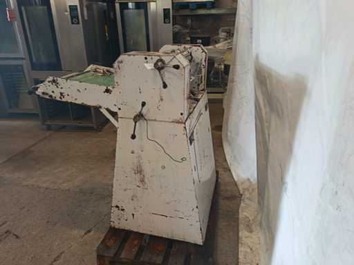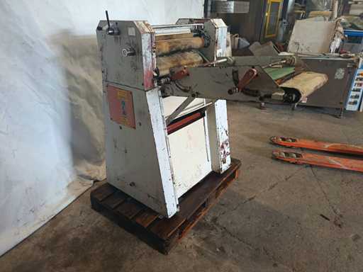 Heavy-duty vloerstaande deeguitrolmachine met verstelbare rollen en handmatige hendelbediening.