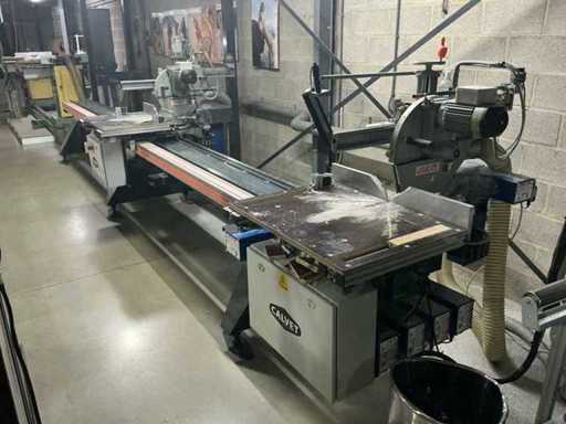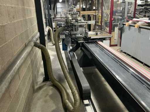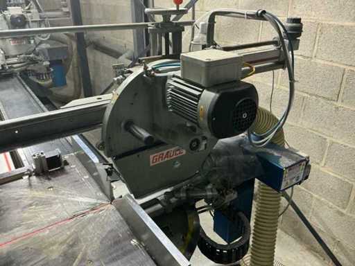 Voorzien van: 2 stuks verstek afkortzaag Graule ZS 170, voorzien van zaagblad voor aluminium, vol automatische lengte, en verstek instelling, 5 stuks Tiger stop, geheel aanstuur baar d.m.v. computer programma, digitale uitlezing, monitor met toetsenbord, software pakket voor invoer afmetingen, pneumatisch bediening, lijnlaser, maximale klembereik werkstuk 400mm, maximale uitslag zaag 300mm, maatvoering kan via programma worden ingevoerd, waarna automatische berekening verstek, afschuining en lengte's.
